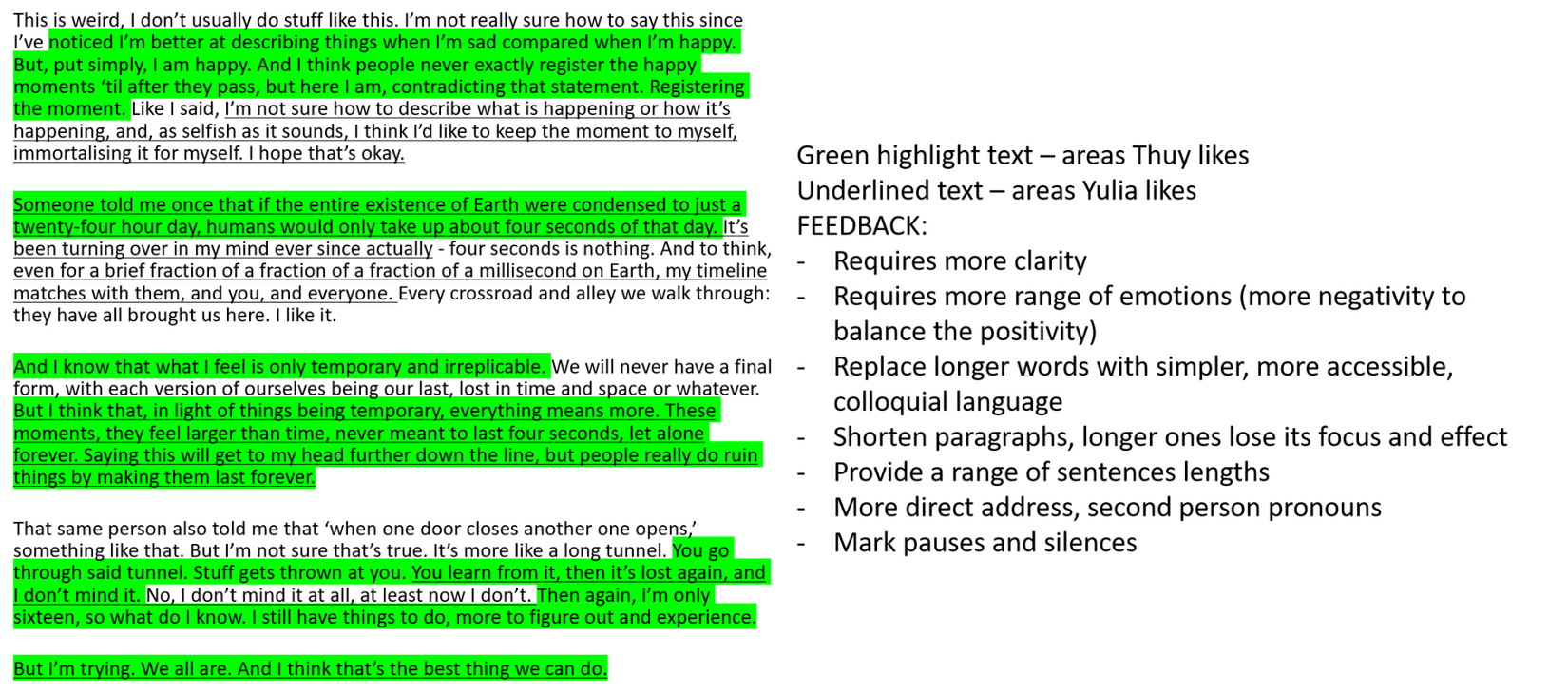 In order to write this monologue, I watched videos on how to write one (also part of the playlist), and took inspiration from three of my favourites screenplays, analysing their similarities. From this, I wrote the first draft of my own monologue and employed these shared written/performance devices in it. I asked for peer feedback, then wrote a final draft.